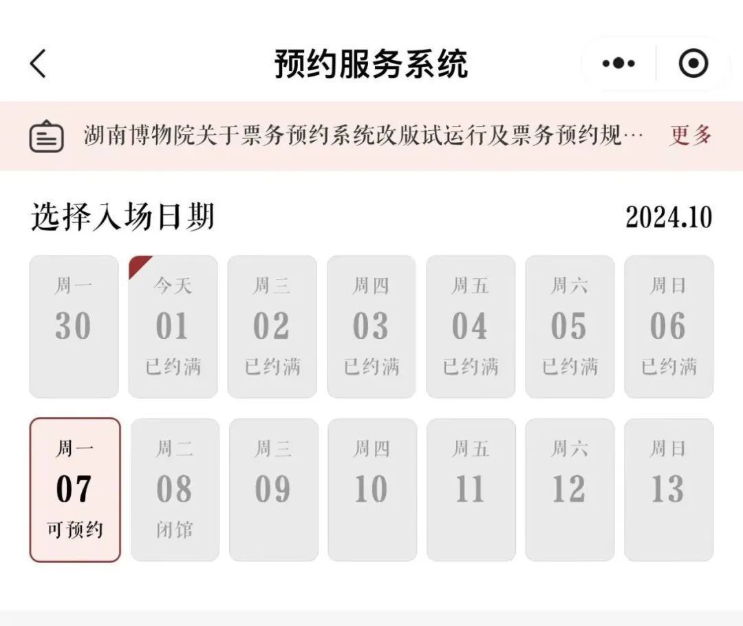 湖南博物院小步调浮现,10月1日至6日参不雅预约已约满。