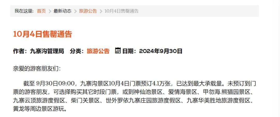 9月29日,九寨沟风景遗迹区解决局发布公告称,遏抑9月29日11:00,九寨沟景区10月2日、10月3日门票预订4.1万张,已达到最大承载量。9月30日,九寨沟风景遗迹区解决局示意,遏抑9月30日9:00,九寨沟景区10月4日门票预订4.1万张,已达到最大承载量。