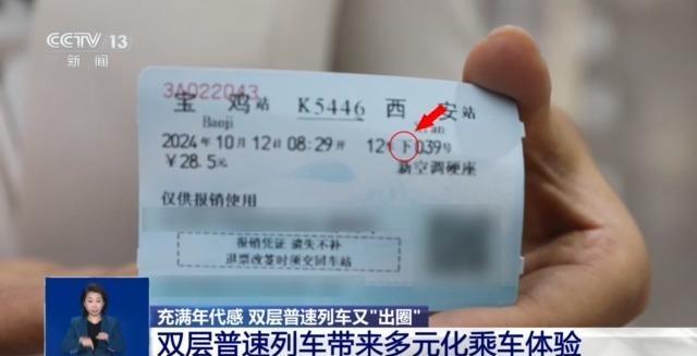 总台央视记者 陈晰:在这趟车的车票上有一个“下”字,单层列车莫得这么的字,“上”和“下”是为了区分上基层,“下”字就暗示我买的座位是在基层。