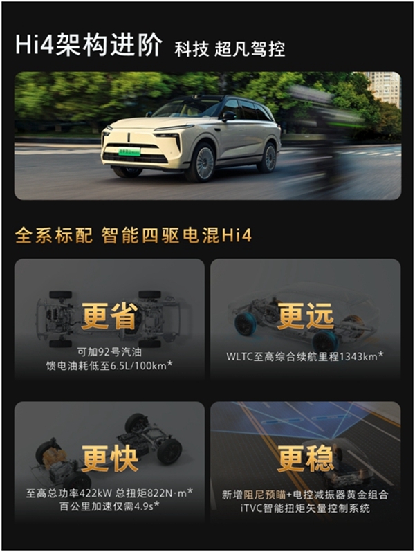 有了聪敏的大脑,还要有壮健敏捷的形体来完整实施。全新蓝山智能进阶版搭载的Hi4 性能版智能四驱电混技巧,具备“省、远、快、稳”四大中枢上风:WLTC轮廓续航里程至高1343km,馈电油耗低至6.5L/100km,可加92号汽油裁减用车老本;至高422kW总功率与822N・m 总扭矩,成就4.9秒的百公里加快;前后50:50轴荷分拨与iTVC智能扭矩适度系统,搭配新增的阻尼预瞄+电控减振器黄金组合,能提前感知路面状态并颐养吊挂软硬,让全家出行兼具操控感与自得性。