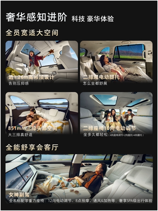 全新蓝山智能进阶版信守“车内无主次”的揣摸打算理念,打造全员尊享的“五好座舱”。空间布局上,近1.26m高吊顶揣摸打算搭配大六座布局,二排配备双电动腿托与10向电动退换功能,三排领有851mm头部空间与4向座椅退换+2向腿托+4向腰托的自得确立,成东谈主可随意坐躺;主驾的八点推拿、副驾的一键零重力款式,让每位家东谈主皆能找到自得姿态。