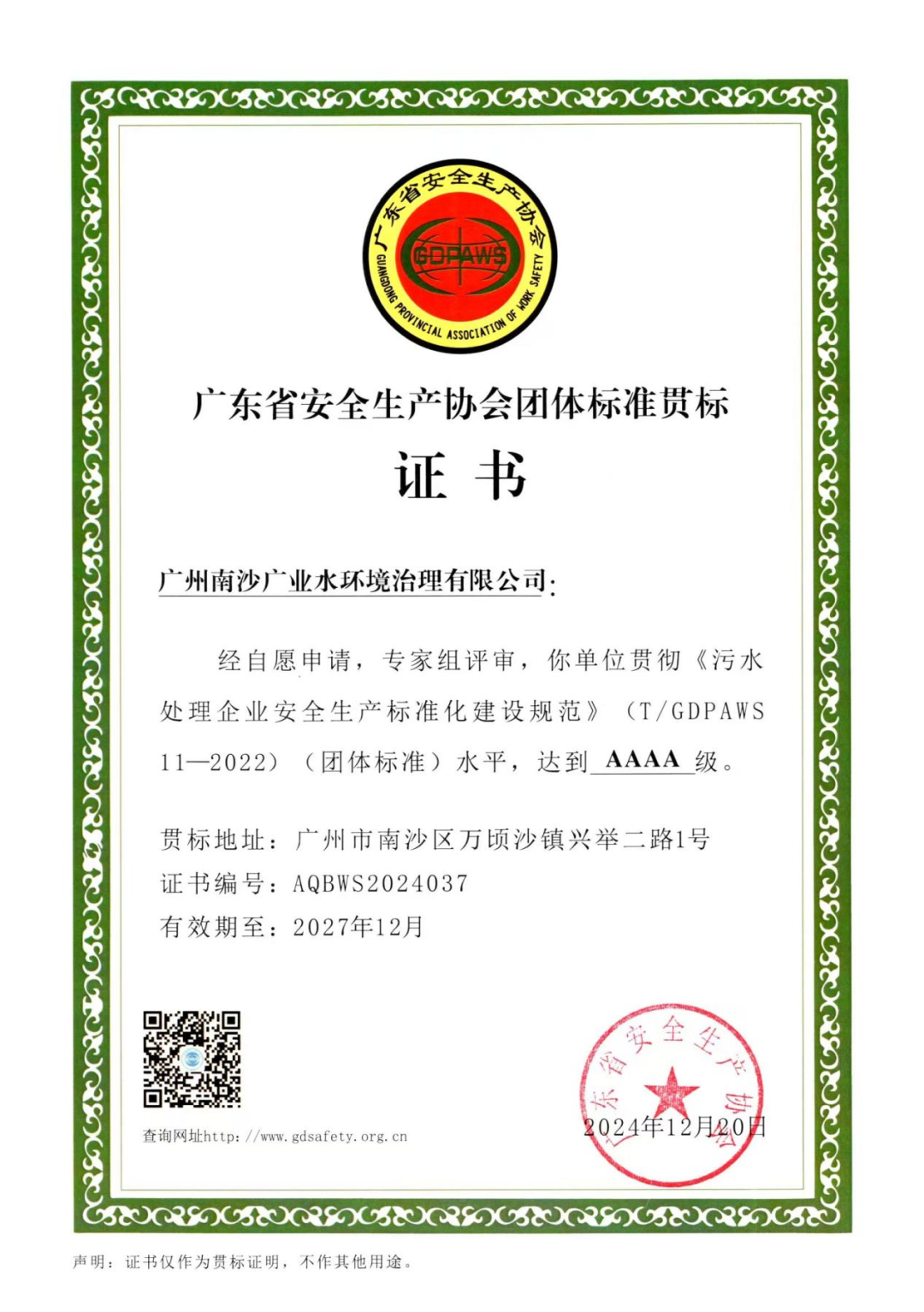 产业园管束局自成立到运营全经由均对四涌西浑水处理厂安全责任提议严格的条目,坚捏“以东说念主为本,安全第一”的原则引导水厂的安全责任。运营单元高度反映,从轨制成立、教会培训、风险防控、救急管束等多个方面开始,继续完善和强化安全坐褥管束体系,积极引入先进的安全管束理念和递次,制定科学合理的安全坐褥管束轨制和操作规程,按期安全检查和隐患排查治理,实时放置万般安全隐患,打造安全坐褥程序化管束体系的成立与贯标责任,于2024年12月20日通过广东省安全坐褥协会团体程序委员会审核评定得到浑水处理厂安全程序化4A级文凭,是南沙区首个且惟一的得到此盛誉的款式,为南沙区浑水责罚责任再创标杆。
