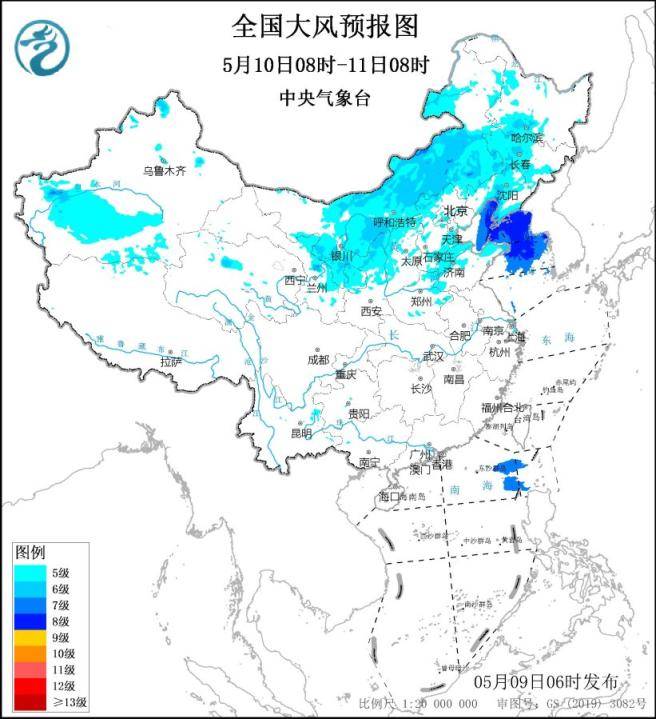 瞻望,5月9日08时至10日08时,辽宁中北部、吉林中部、内蒙古大部、新疆东部和南疆盆地、青海西部、甘肃西部、宁夏大部、陕西北部、河北南部等地的部分地区有5~6级、阵风7~9级的大风;渤海、渤海海峡、黄海北部、台湾海峡、巴士海峡、南海东北部海域将有7~8级、阵风9级的大风。