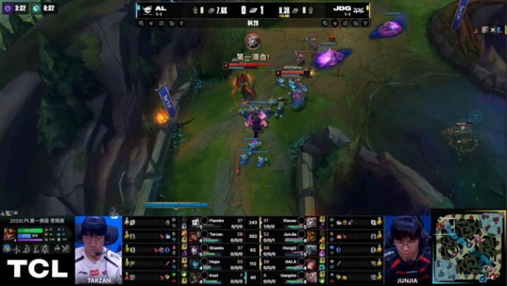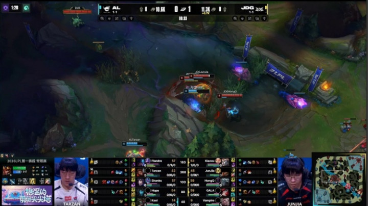 [2444]AL搏命开大龙,GALA女枪开扫击杀Tarzan山公,JDG抢掉大龙,三角草HongQ韦鲁斯被王杰卡莉丝塔逮捕,两边打出2换2。