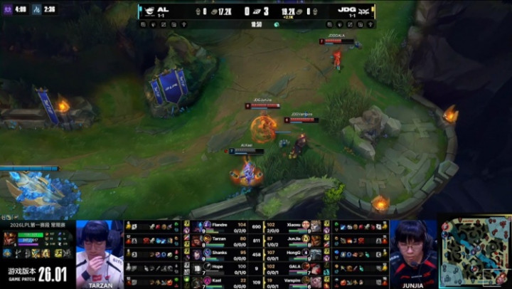 [26:51]野区混战,徐神亚恒先斩Kael再杀Shanks狐狸,Junjia野区被Flandre追击至死,徐神亚恒青龙偃月刀开砍三杀完毕团战,JDG打出3换5团灭AL,经济越过5k。