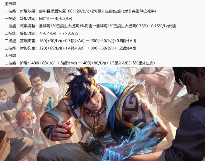 裴擒虎加强:虎情势1妙技新增掷中回血,虎情势的伤害增高,东说念主情势2妙技的护盾增厚。