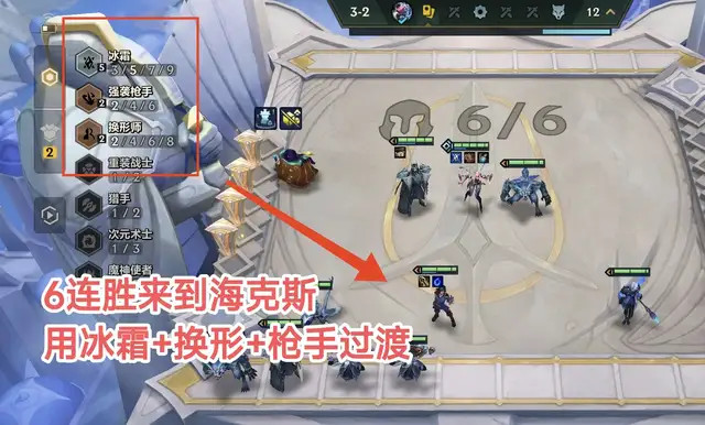 这里开局采选冰霜+换形过渡,前期有冰霜转的情况下,冰霜尽头强势,一起6连胜,来到了3-2海克斯。