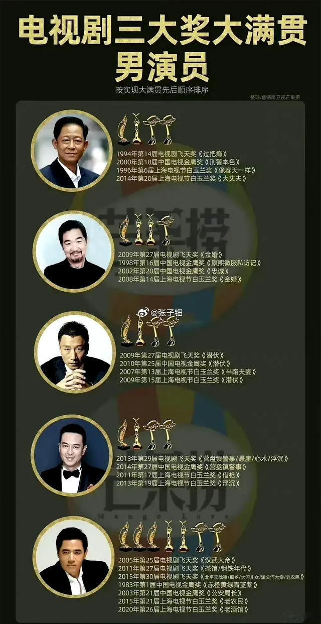 亦然链接张国立、王志文、张嘉译、陈宝国、孙红雷之后第6位大满贯。