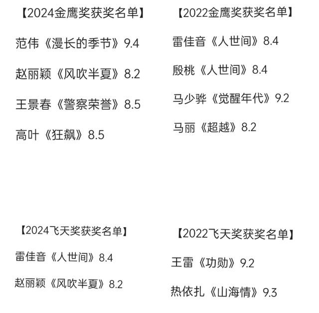 金鹰飞天近几年获奖的演员齐是豆瓣8分以上的剧,说到底照旧要从高口碑剧内部选,而白玉兰所颁给的《不完好受害东说念主》女主角《县委大院》女主角等6、7分的剧,金鹰飞天齐莫得给奖(8分是门槛 , 8分以上的内部重心选 ,不是比谁评分高)