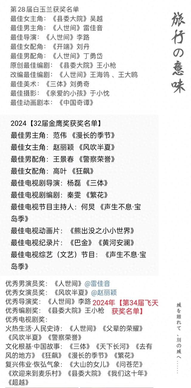 第 32 届金鹰奖完整获奖名单。 个东说念主认为是上海白玉兰奖、中国飞天奖、中国金鹰奖三大高热度奖中,抽象题材、创作、影响力看最客不雅公证得东说念主心的,亦然近几届金鹰奖的最好。