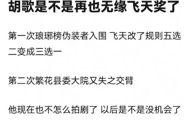 胡歌本年飞天奖没得奖,实在是太缺憾了……拿三年时代拍的似锦,效果还没称愿拿到飞天……胡歌此次凭借《县委大员》《似锦》提名,效果却再次陪跑了,9年前胡歌主演的《琅琊榜》《伪装者》亦然双双提名,但也仍旧无缘飞天大奖。