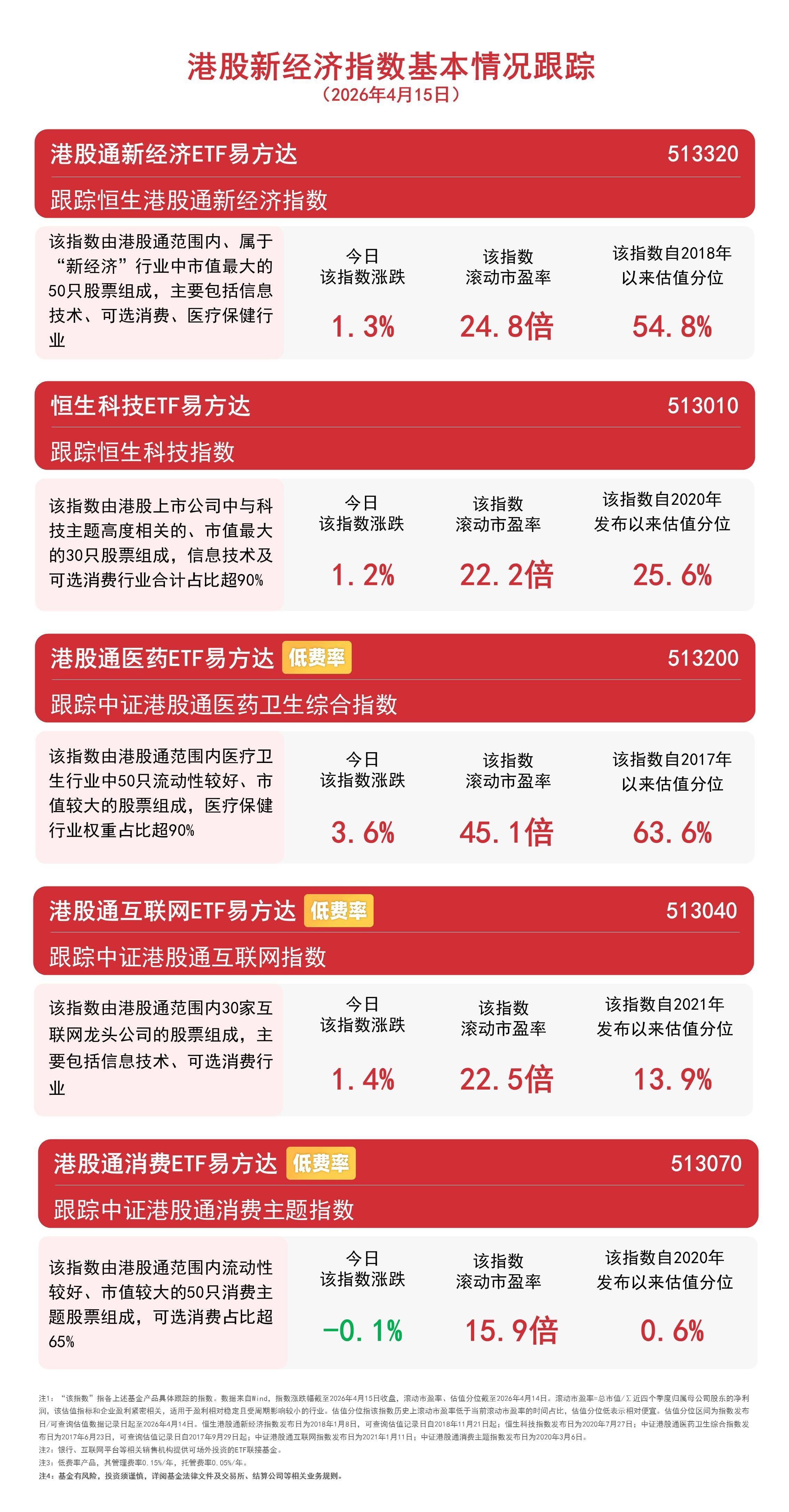 4 月 15 日,港股市集不时反弹行情,新经济板块多点吐花,医药赛说念领涨全场,科技、互联网龙头同步走强。死心当日收盘,中证港股通医药卫生抽象指数大涨 3.6%;中证港股通互联网指数飞腾 1.4%,恒生港股通新经济指数飞腾 1.3%,恒生科技指数飞腾 1.2%,仅中证港股通销耗主题指数微跌 0.1%。