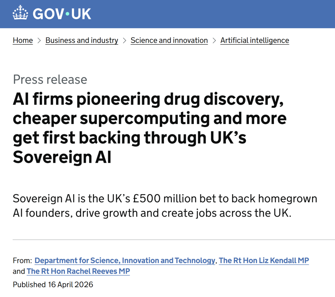 2026年4月,英国政府告示启动限度为5亿英镑的主权AI基金,灭绝模子拓荒、智能AI代理、药物研发等多个规模。