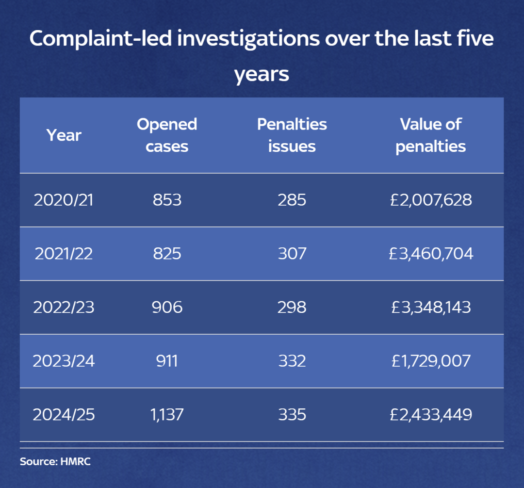 在这些举报股东下,HMRC旧年一共发起了1137项探问,并最终开出了335笔罚金,罚金总数达到240万英镑。