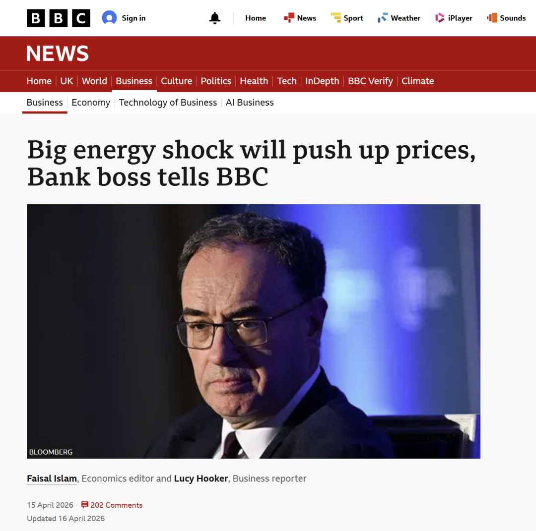 据英媒报谈,4月15日,英国央行行长贝利现身在华盛顿举行的国外货币基金组织(IMF)会议。他会后在经受BBC采访时暗示,面对伊朗干戈激发的动力价钱冲击,央行“不会急于”对加息作念出判断。