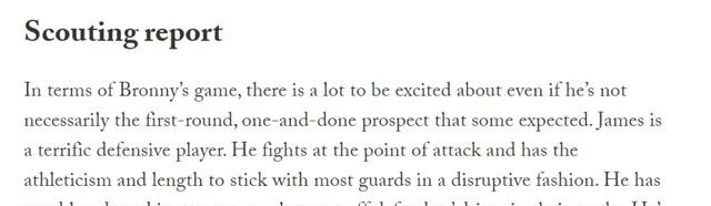 The Athletic的选秀行家Vecenie公布了布朗尼大一的球探论说。从论说中不难发现,布朗尼有不少亮点但也有许多不及,可能莫得作念好打NBA的准备。论说如下——