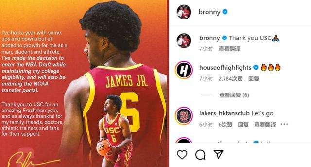 布朗尼在INS社媒上写说念:“在当年的一年中,当作一个东说念主、学生和通顺员,我经历了许多放诞转机。我还是决定参加NBA选秀,同期保留我的大学阅历,并参预NCAA转会学派。感谢USC(南加州大)让我渡过了一个很棒的大一学年,同期我也感谢我的家东说念主、一又友、医师、涵养和球迷们的撑合手。”
